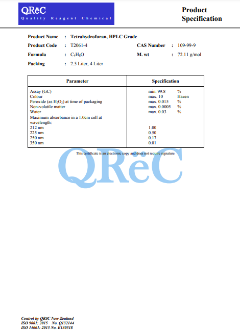 หยิบลงตะกร้า | Tetrahydrofuran, HPLC 2.5 L. QReC™ ![]()