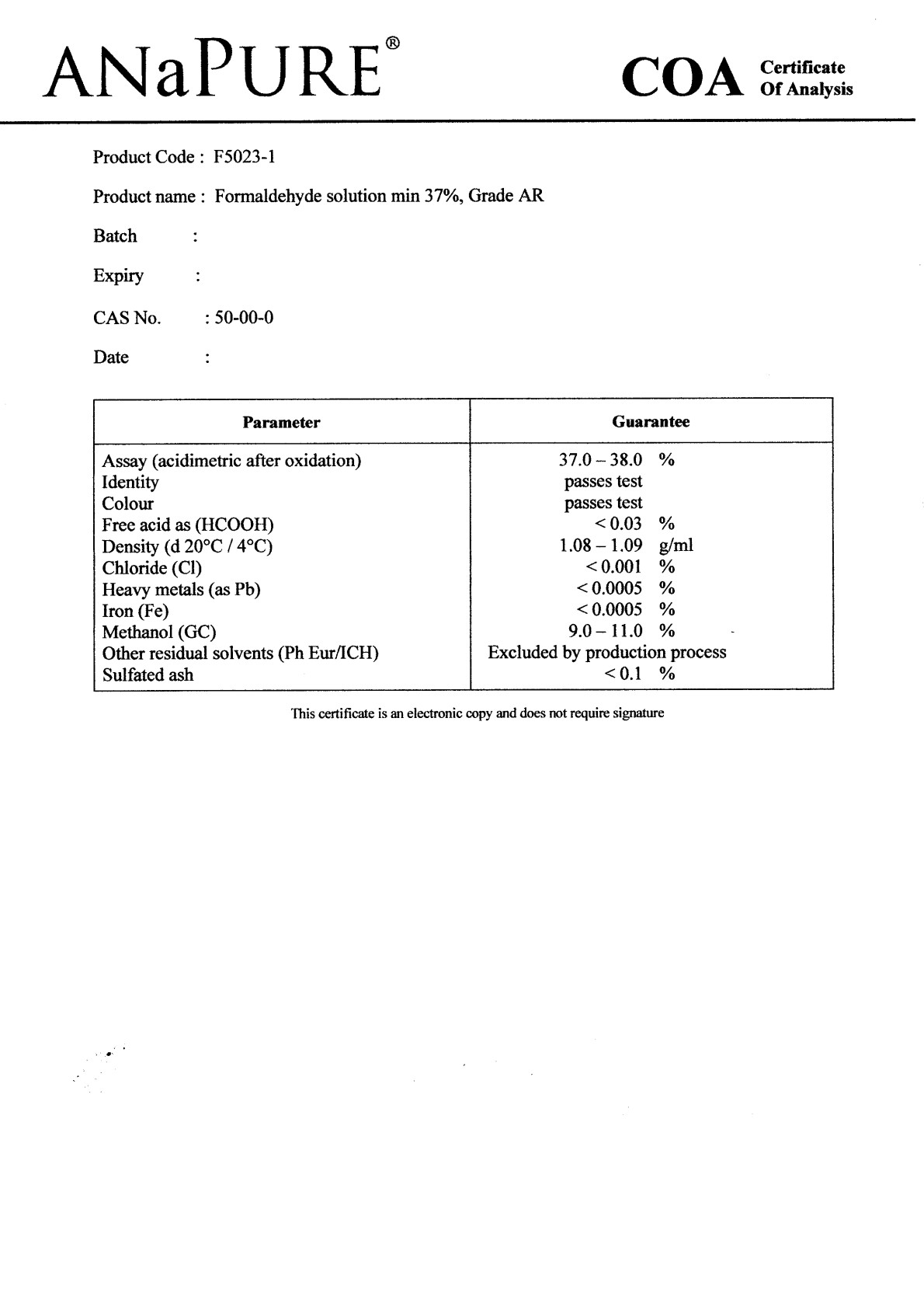 Formaldehyde Solution 37%, AR 20 L. ANaPURE™Formaldehyde Solution 37%, AR 20 L. ANaPURE™