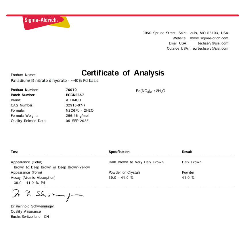 รหัสสินค้า | 76070- Palladium (II) Nitrate Dehydrate ~40% pd basic |
